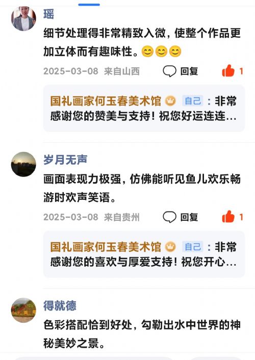 作为“国礼画家”,何玉春的作品不仅是技法的呈现,更是文化精神的传递。当观者在画中“感受到生活中的点滴美好”(《夺》评),当“艺术的无限魅力”(《随心随性随缘》评)跨越地域与年龄,这种共鸣恰恰证明:好的艺术,既能扎根传统土壤,又能生长出现代人心底的向往。